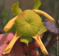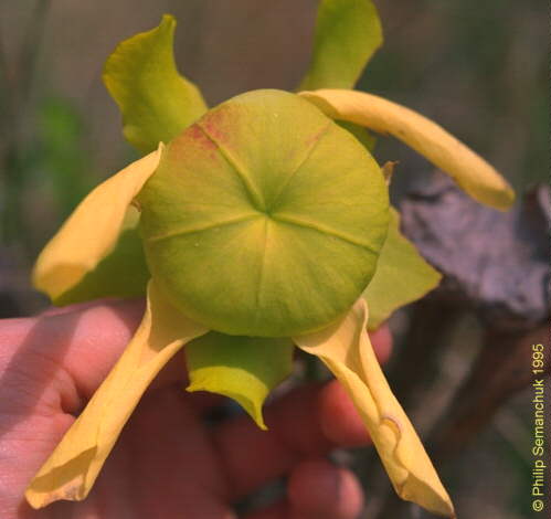 Close-up of a Sarracenia flava flower in the Green Swamp near Wilmington, NC, USA, April 28, 1995. The flower's style (the round part that you see) was about 6-7 cm (2.25 inches) across. The parent plant was growing among tall grasses with some scrub and small trees in the area. The soil was damp to the touch and was typical of the acidic sand/peat mix found in the swamp.