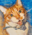 My cat Milo. He would sit and listen to guitar lessons when Michele Duva would visit. Michele wrote a book about him titled "Waiting for Dawn" and this image became the cover. Stanford developed the grassy field next to my house, driving out all the native rodents. Their attempt to control the situation led to Milo eating a poisoned blue-jay. He died three days later from kidney failure. This is his memorial picture. Multimedia on 2'x2' masonite panel.